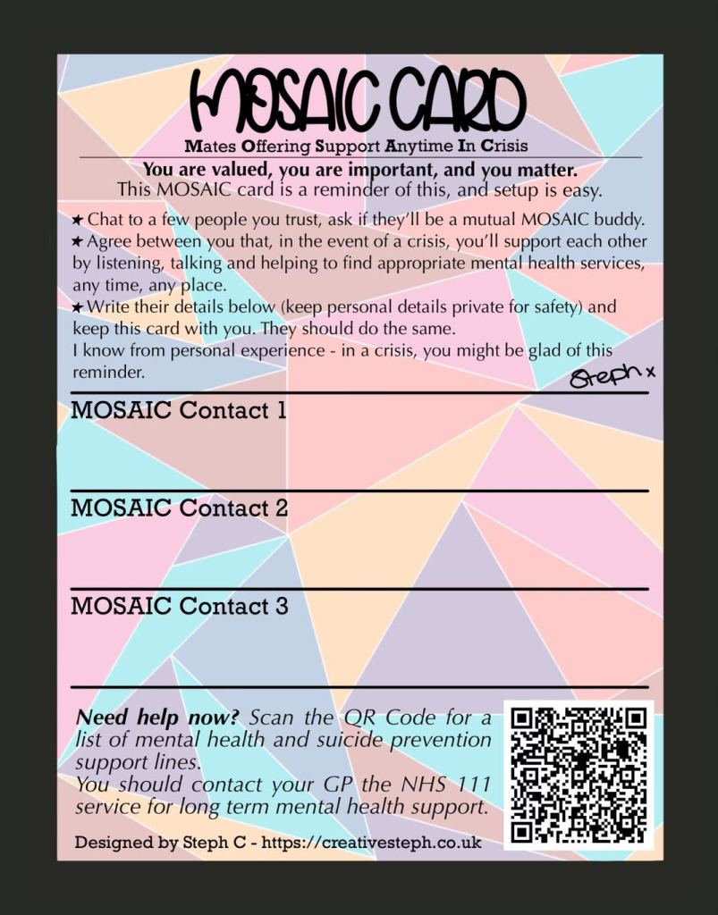 You can also add yourself or your organisation to the waitlist for the next print run of FREE MOSAIC cards by emailing me at steph@creativesteph.co.uk.