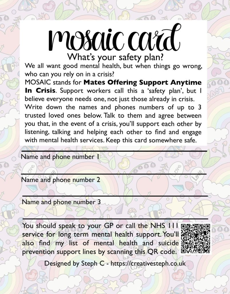 2 – A form for everyone to complete their own MOSAIC (Mates Offering Support Anytime In Crisis) list. The MOSAIC list is the latest part of the Cope Campaign and it’s a simple but important mental health and suicide prevention tool for ANYONE to keep handy, because it’s nice and small. Most mental health centered organisations create this type safety plan for those already in crisis, but (in my opinion) that can sometimes be leaving it too late. I want to prevent more lives being lost by making it simple for those in crisis to remember who their trusted friends are. A MOSAIC list can and should be created before a mental health decline even happens, and it can all be done in the little card I’ve designed.