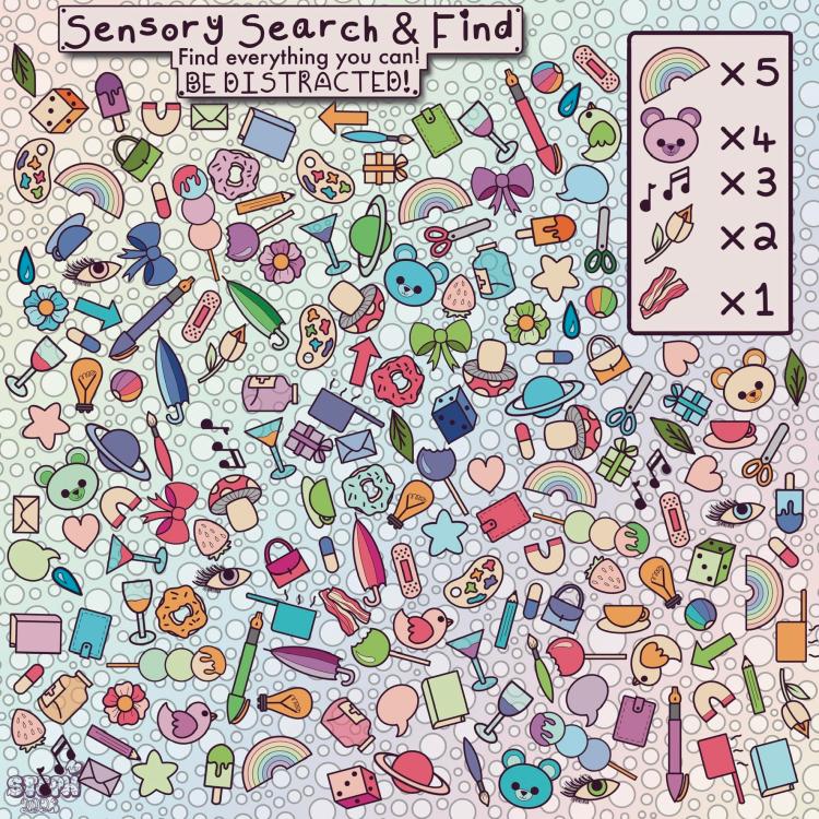 One of the most simple and effective distractions is using our senses to guide us. The image above was created by me as a basic sensory serach and find to distract you. See if you can find the bacon, bears, rainbows, notes and flowers. Then, see what else you can find!